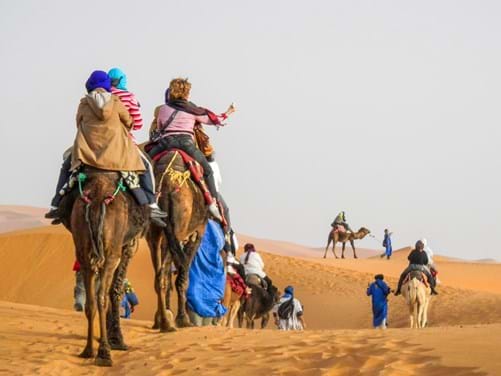 Je nach Reiseverlauf können Familien Teile der Dünen auf Kamelen überqueren, was oft lange nach dem Ende der Reise in Erinnerung bleibt. Das langsamere Tempo gibt Zeit, die Größe der Wüste und die wechselnde Oberfläche des Sandes wahrzunehmen. Das Erreichen einer höheren Düne bei Sonnenaufgang oder Sonnenuntergang kann zeigen, wie Licht denselben Ort innerhalb weniger Minuten verändert, sodass die Natur selbst zum Hauptinteresse wird.